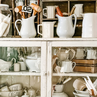 (Tiered trays, toile wallpaper, chippy cabinets...ooooohhhh no...I spy some Rae Dunn too! The decor police are definitely coming for me!)